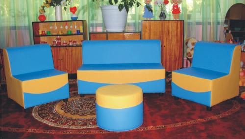 В наборе: диван "Каркасный" (100 х 55 х 60 см) - 1 шт, кресло "Каркасное" (50 х 55 х 60 см) - 2 шт, пуфик круглый (d = 40 см, h = 30 см) - 1 шт.